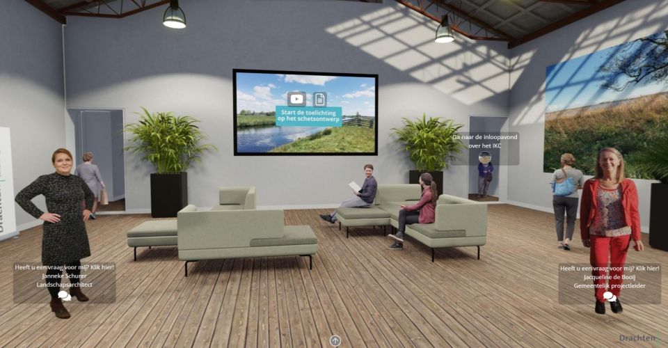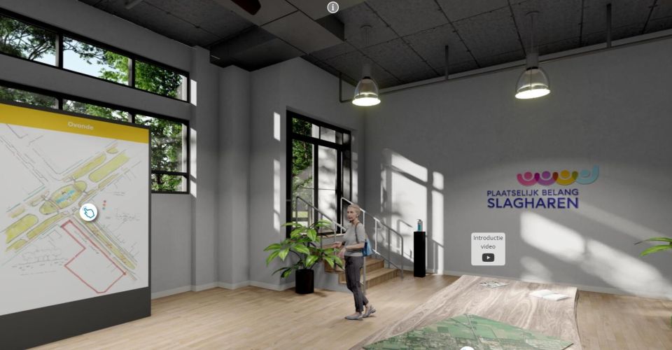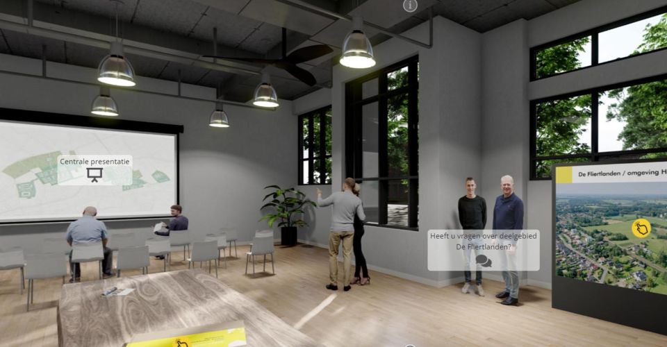Een informatieavond of een projectpresentatie kan ook heel goed digitaal! Een digitale presentatieruimte is een mooi middel om je project vorm te geven. In deze 360-graden viewer zijn alle denkbare opties beschikbaar. Bijvoorbeeld een zoom-bijeenkomst op een vooraf geplande tijd, informatiepagina's, 3D-visualisaties raadpleegbare GIS-kaarten , animaties , vragenlijsten en rechtstreeks contact met de bezoeker. Dit kan allemaal binnen de digitale ruimte.