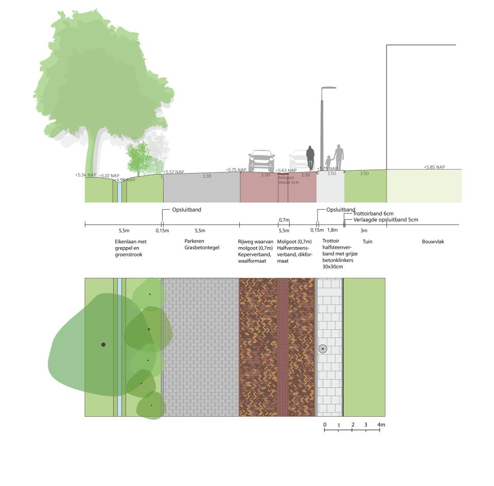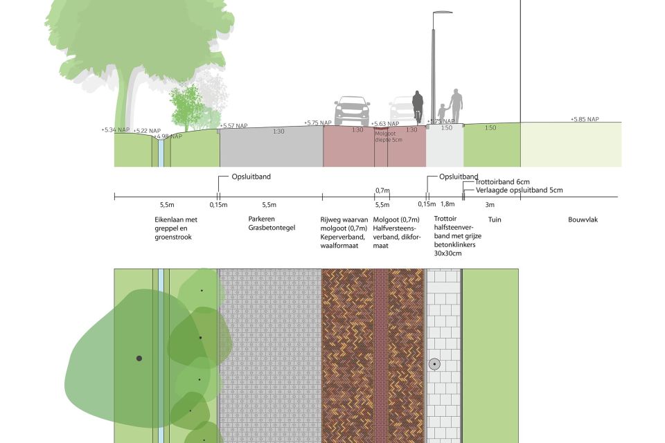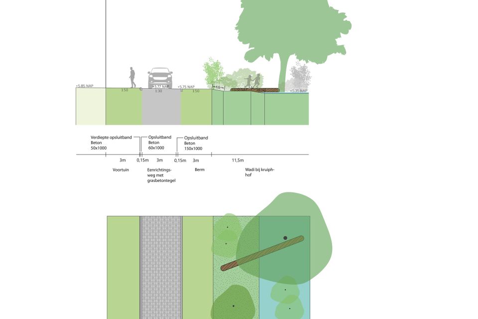 Voor de woonwijk, en daarmee ook voor de openbare ruimte, kozen we als uitgangspunt een groene wijk met veel aandacht voor het veranderende klimaat. Water is daardoor een centraal onderwerp in het inrichtingsplan. Er komt bijvoorbeeld geen rioolstelsel.