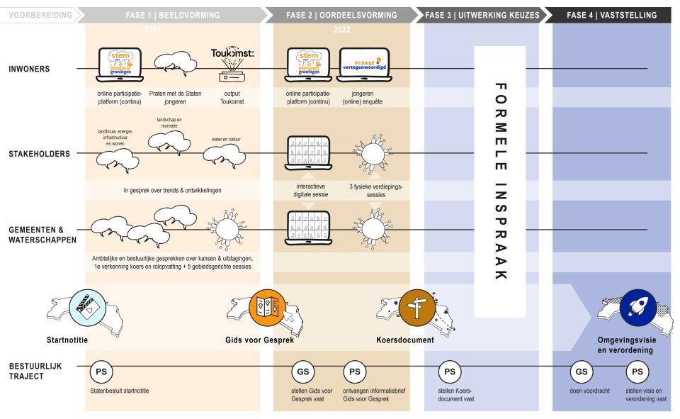De resultaten van de gesprekken vormden de input voor het Koersdocument. Het heeft geleid tot ontwikkelprincipes voor Groningen en een aanzet voor een gebiedsgerichte aanpak in de Omgevingsvisie. Bovendien heeft de provincie een voorzet gedaan voor de rol die ze wil vervullen: meer als denktank aan het begin van een proces om zo doelen en ambities te verwezenlijken en minder als toetser aan de achterkant.