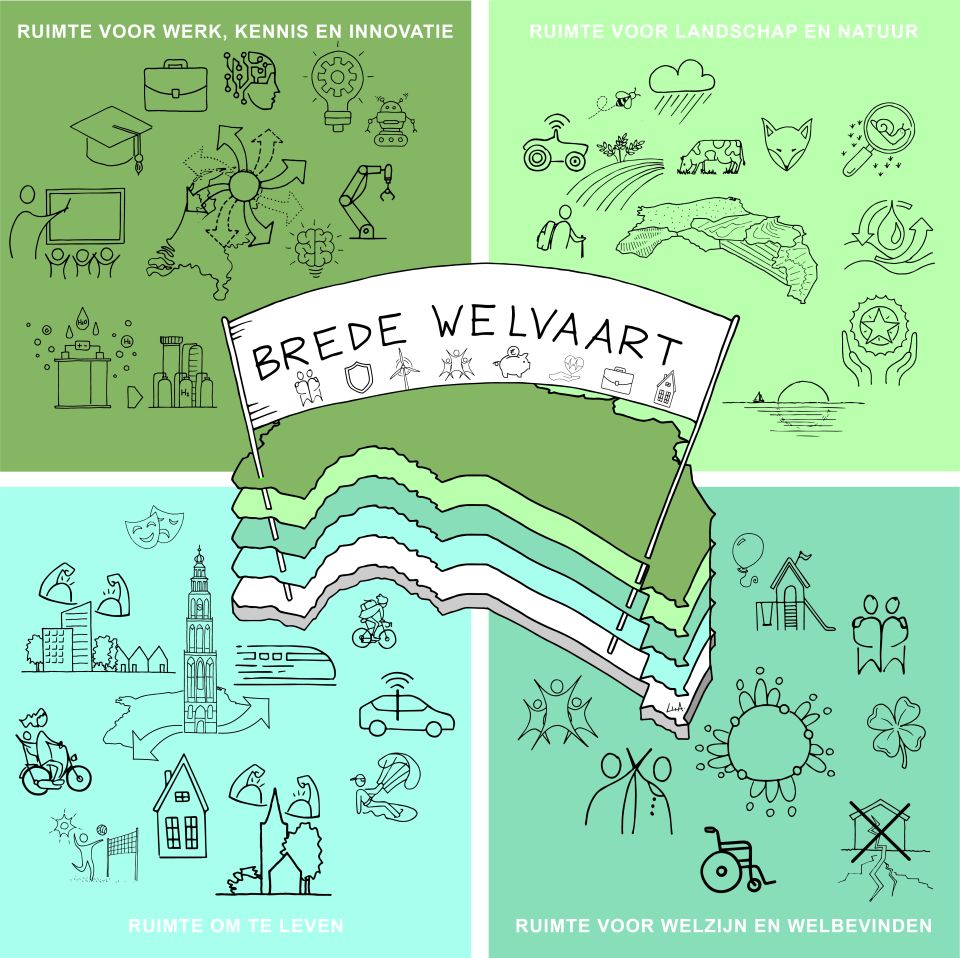 In het Koersdocument duiden we de doelen, ambities en opgaven voor de provincie Groningen. Integraal, zoals de Omgevingswet van ons vraagt en verbonden aan het overkoepelende doel ‘brede welvaart voor alle Groningers’. Dat staat voorop. De ambities en opgaven zijn op deze brede welvaart gericht.