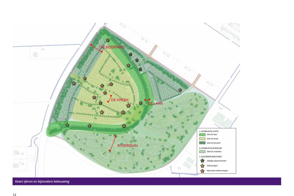 De interactieve participatie leidde tot een opdeling van de woonwijk in twee delen. Het noordelijke deel heet ‘in de luwte’ met bosrijke randen in de vorm van windsingels. De bestaande structuur van Swifterbant bood inspiratie. Een brede bosrijke strook ‘omarmt’ de woonwijk als het ware waardoor de wijk letterlijk ‘in de luwte’ van de wind ligt. Het zuidelijke deel heet ‘Rivierduin’ en is gebaseerd op de rivierduinen in de ondergrond en de archeologische vondsten uit de Swifterbantcultuur, waarmee het dorp sterk verbonden is. In ‘Rivierduin’ is dit oorspronkelijke landschap te ervaren en te beleven.
