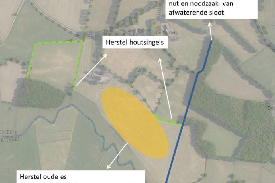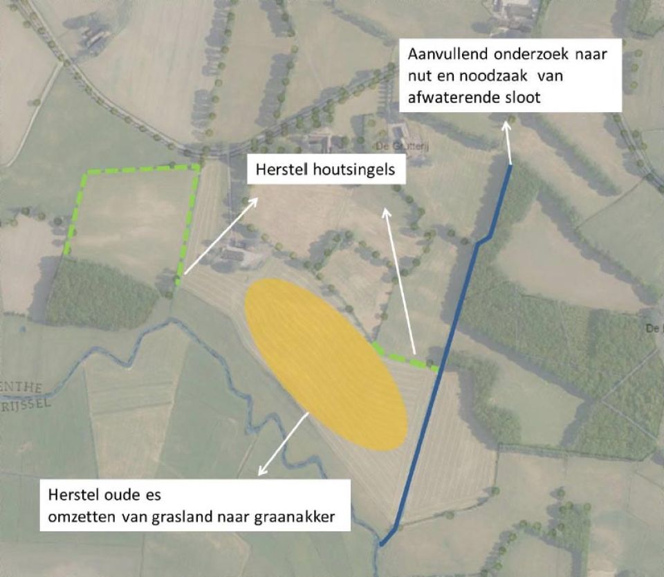 - Het grasland en de twee essen worden hersteld. Deze kunnen weer in gebruik genomen worden als weiland/hooiland resp. graanakker. Tot het midden van de jaren zeventig van de vorige eeuw waren de essen ook als akker in gebruik.