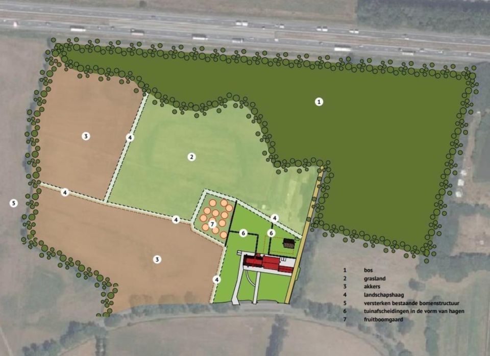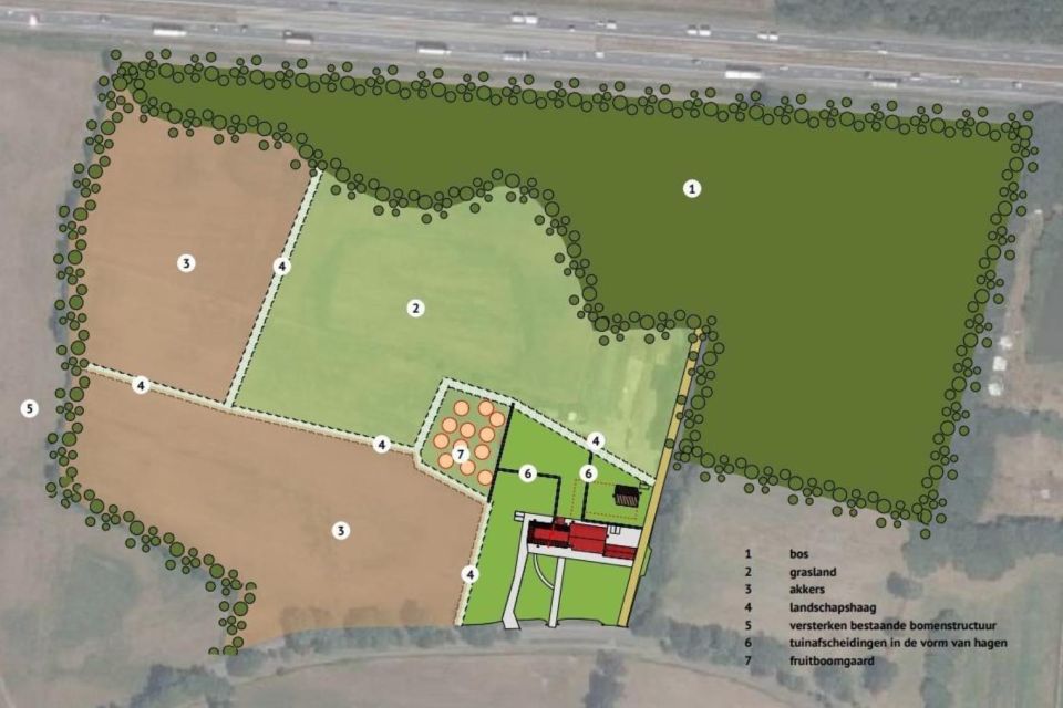 - Direct ten westen van de boerderij wordt een deel van het bestaande grasland omgezet in tuin. Daarmee wordt de situatie uit het begin van de 20e eeuw hersteld, toen het huiserf aan de westzijde ruimer was. Hierdoor krijgt de woning die in dit gedeelte van de boerderij wordt gerealiseerd ook meer ruimte ten opzichte van het naastgelegen agrarisch land.