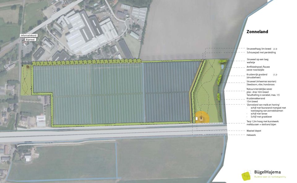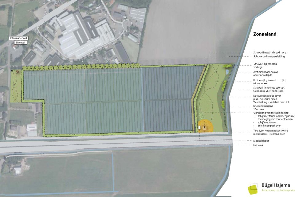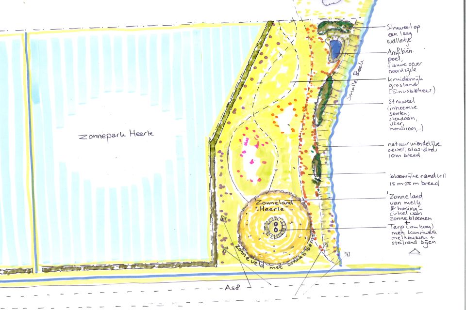 Een mooi voorbeeld hiervan is de ontwikkeling van het zonnepark De Melkbussen bij Heerle, Roosendaal. Hier is gekozen voor een strakke invulling met zonnepanelen, met aan de oost- en westzijde ruime zones met een natuurlijke, ecologische inrichting. De oostelijke zone is een groot gebied tussen een persleiding en een ecologische verbindingszone (Groenblauwe mantel). Hier komt een natuurvriendelijke oever met een waterpoel, zeer geschikt voor libellen, amfibieën en watervogels. Daarnaast komt een rand met akkerfauna, geschikt voor weidevogels zoals patrijs en gele kwikstaart. Tussen de persleiding en de oever resteert dan nog circa twee hectare. Hier komt natuur waar de relatie met het zonneveld centraal staat. Op een verhoging komt een kunstwerk van twee melkbussen. Dit is een bestaand kunstwerk, bekend in deze omgeving. Daaromheen komt een ‘zonneakker’ met graan, akkerkruiden, zonnebloemen en nestplaatsen voor wilde bijen. Hieromheen komt een stuk kruidenrijk grasland, waar men sinusbeheer toepast (een maaimethode in golvende lijnen waar steeds een deel van de begroeiing blijft staan). Met sinusbeheer blijft begroeiing opnieuw opkomen door te maaien, en tegelijk blijven voldoende overlevingsplekken voor insecten behouden.